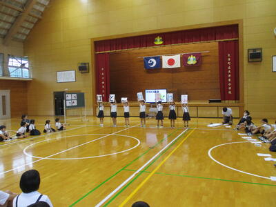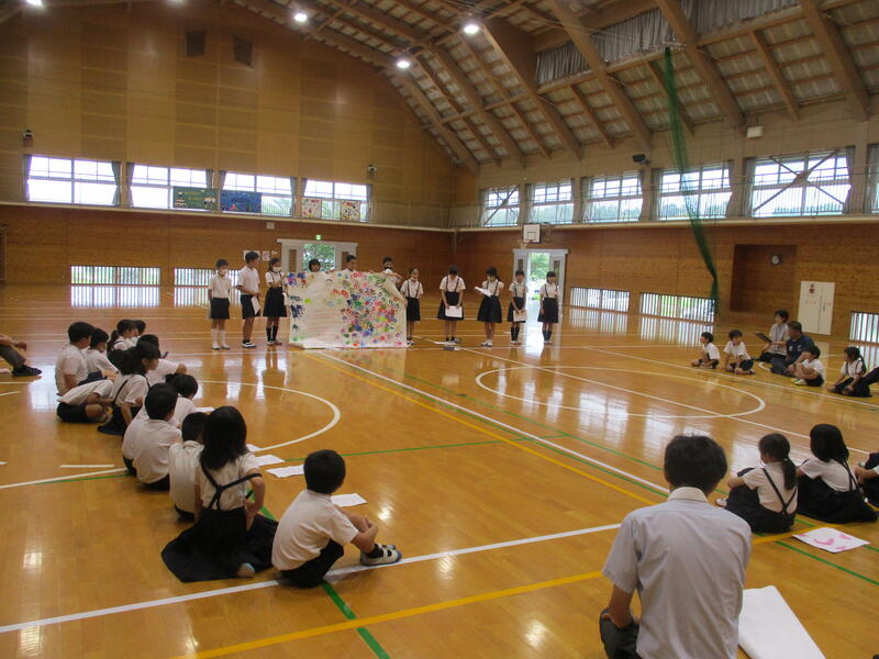 この集会では、①教材での学び、②そこで考えたこと、③自分自身のことを、各学年が発表します。他人(ひと)事ではなく、自分事とした会となり、とても温かな気分になりました。