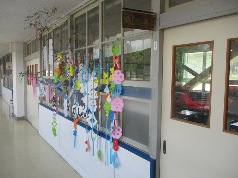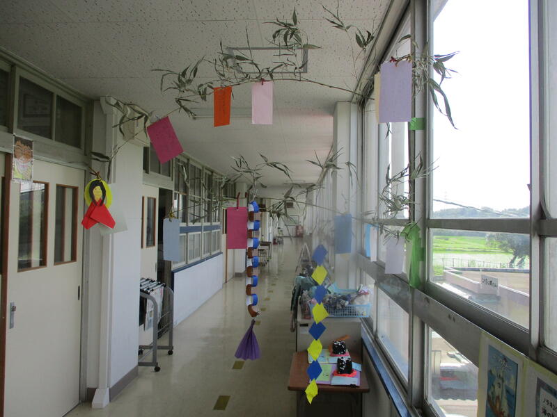 学校の廊下や教室には、明日(7/7)の七夕飾りが並んでいます。