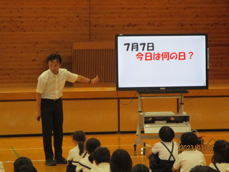 教頭先生の講話に、子どもたちの目も輝いていました。そこでは、友達の思いや願いを短冊で知ることの大切さも知りました。