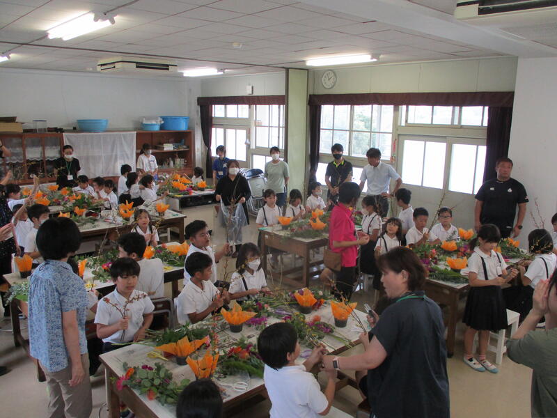 本日(9/28)、玄関や職員室前の廊下に、昨日児童が生けた花が揃いました。どの花もとても綺麗に生けてあり、来校された方々をしっかりとお迎えしています。明日持ち帰りますが、水を差さないと直ぐに枯れてしまいますので、各家庭でよろしくお願いいたします。