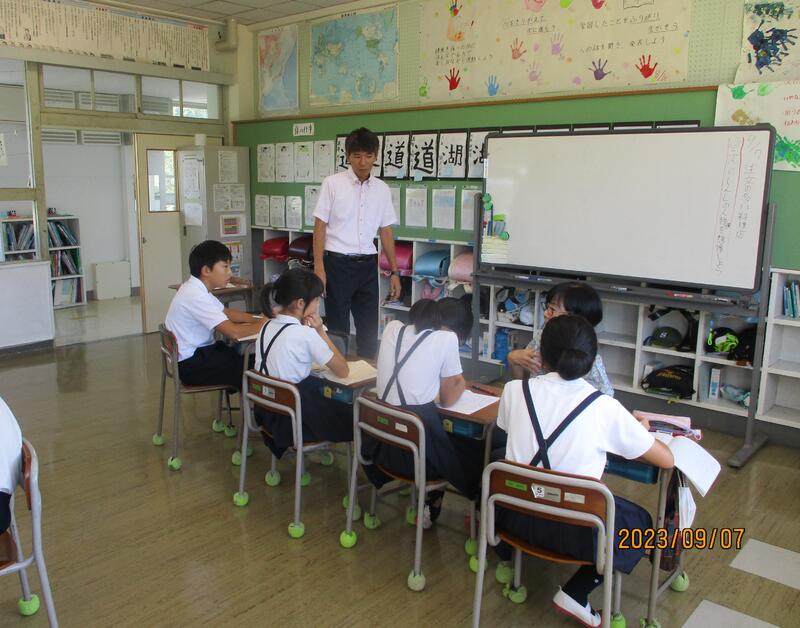 本日(9/26)、大津中2年生(本校卒業生)が、職場体験に来てくれました。職場体験は、中学生にとって、学校の様々な職員の動き等を学び、将来の夢に大きく近づくための絶好の機会です。同時に、小学校としてもありがたいことばかりで、まさしくWin=Winの取組といえます。