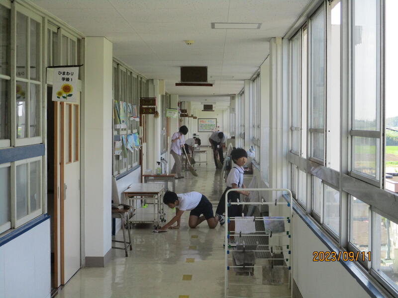 その一つが、掃除です。班長さんを中心に、高学年生が低学年生に優しく教えます。また、掃除の終わりには、みんなで集まって反省会もします。