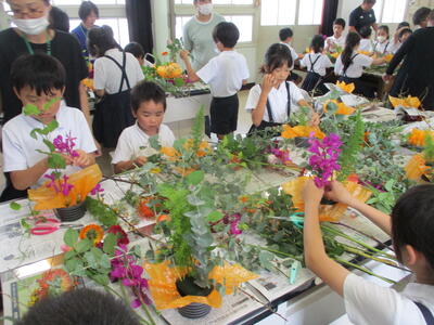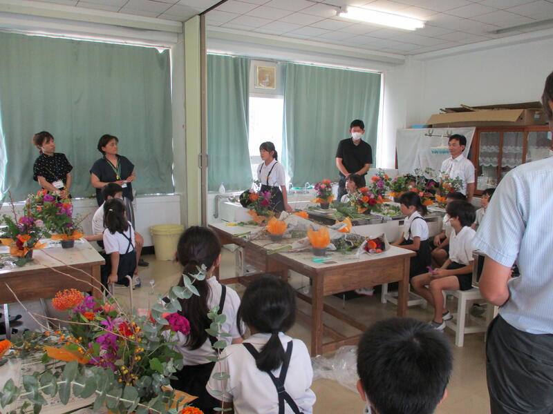 本日(9/27)、県花き協会等のご協力により、4名の講師をお招きして“フラワーアレンジメント”をしました。