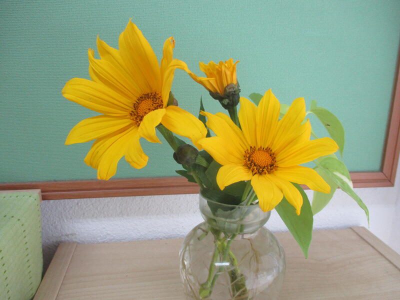 今朝(11/30)、ひまわりの一種の花を、登校ボランティアの桜間さん(大林)にいただきました。玄関、校長室や各教室に飾っています。花があると、ぱっと明るくなった様な感じになります。どうもありがとうございました。