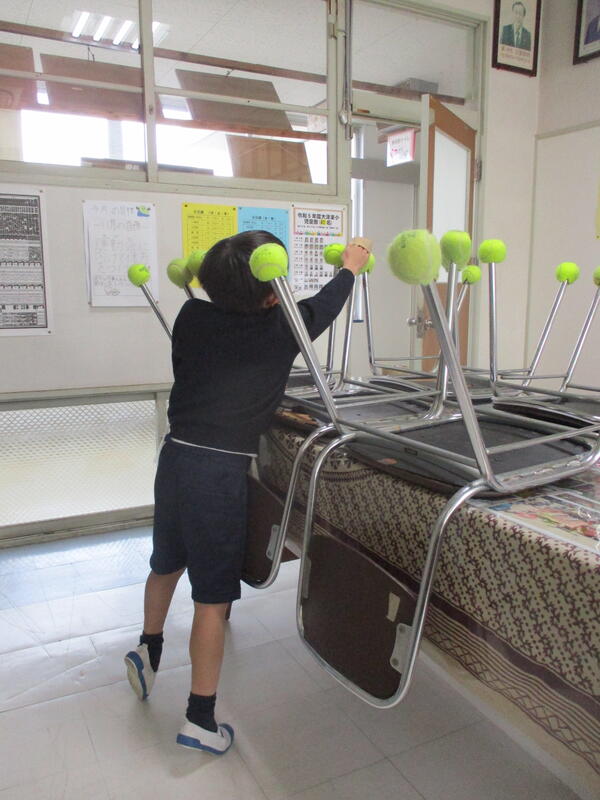 床を隙間無く雑巾で拭き上げ、最後は椅子の下に付いているテニスボールのほこり取りを取って終了です。早く終えた時は、1・2年教室までほこり取りの出張に出かけます。