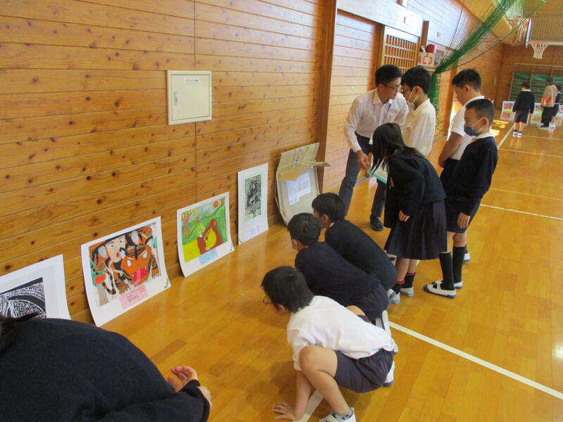 本日(12/13)、本校の体育館で巡回絵画展を行いました。ここに集まった作品は、先日の町文化祭絵画展において“町特選”に選ばれたものです。その力作を前に、子どもたちはそのよさを鑑賞することができました。