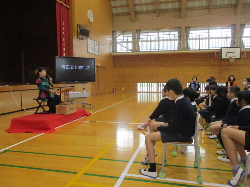 本日(12/14)、熊本県の民話の第一人者 寿咲亜似(すさきあい)さんとみんわーず(3名)をお招きして、“民話を楽しもう会”を実施しました。地域の方々も回覧板で周知した効果で、7名来校いただきました。