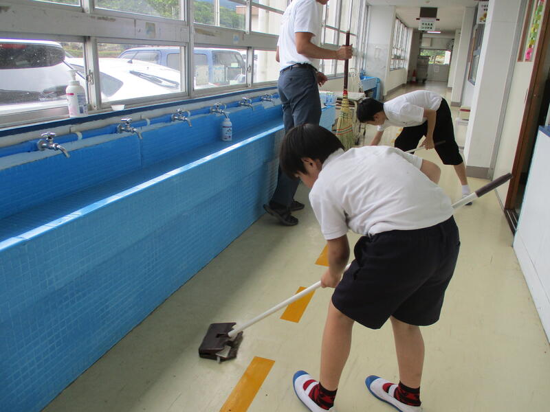 昨日(5/27)、プール掃除をしました。これまでは、子どもたちが2時間かけて行っていましたが、今年からは業者(日野環境さん)委託でプール内だけはしていただくこととなりました。