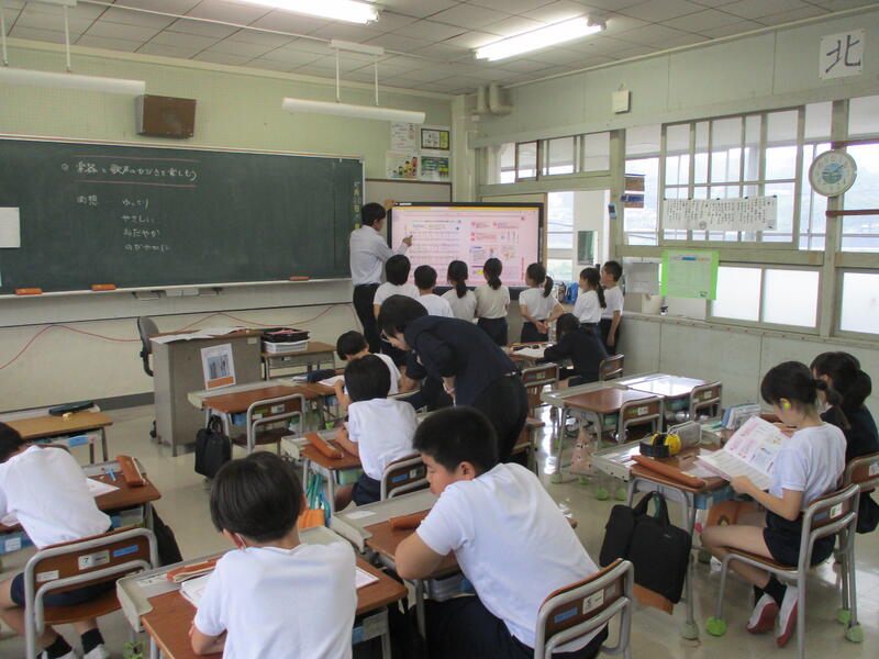 3・4年生は、先生たちと音程を確認しながら歌を歌っていました。5・6年生は、先生の話を聞きながら、自ら算数の学習を進めていました。特別支援学級では、楽しい交流会になるように話し合いをしていました。