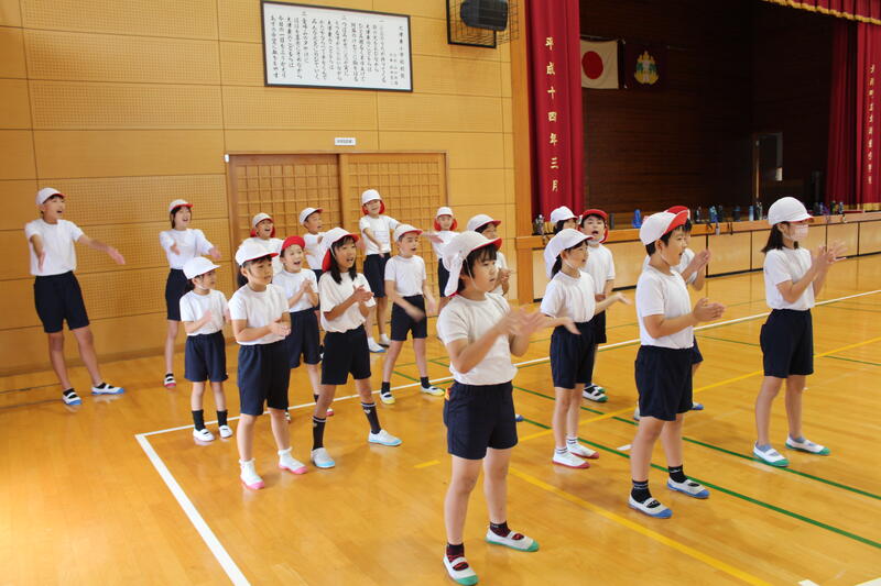 本日(10/29)、運動会の全体練習をしました。あいにく小雨が降ってきたため、体育館で実施しました。
