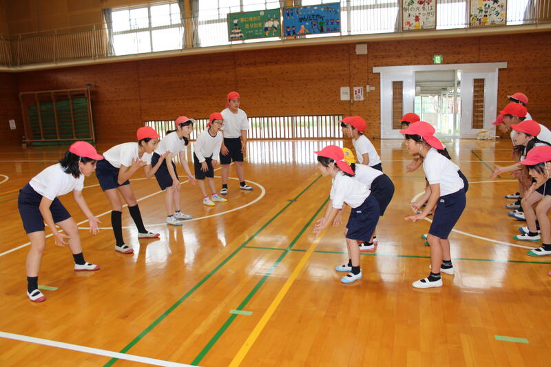 体育主任が子どもたちの心構えを確認し、徒走、台風の目、応援団の順に練習しました。実際に、運動会当日が雨天の場合、体育館で実施することになるため、子どもたちも気合いが入っていました。