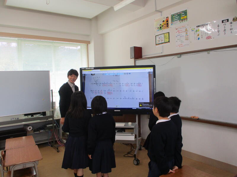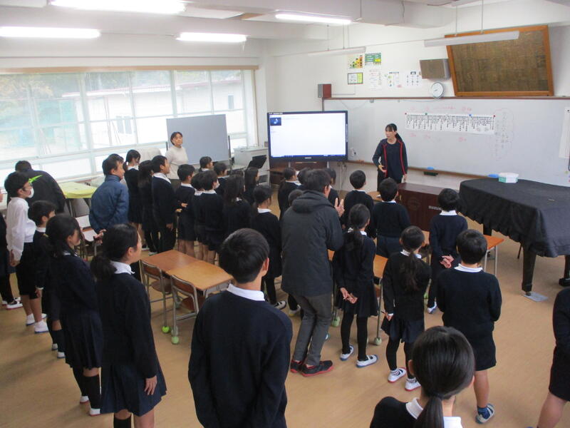 今回は、21日の学習発表会の際に全校児童で披露する歌の練習です。丁寧な先生の指導に、子どもたちはメキメキと上達し、簡単な手話も覚えました。21日は、乞うご期待です!
