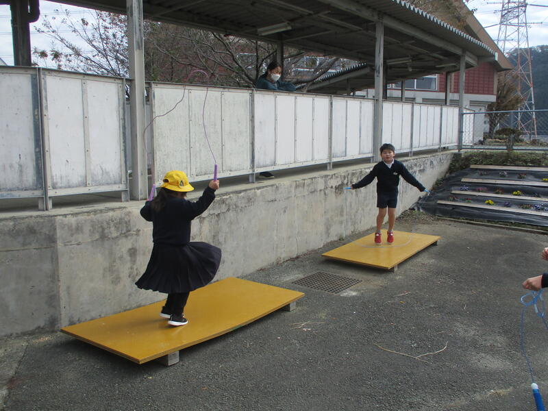 最近、縄跳びジャンプ台を使って低学年の児童が縄跳びの練習をしています。順番を守って、自分が身に付けたい種目(前跳び、二重跳びなど)を練習しているようです。