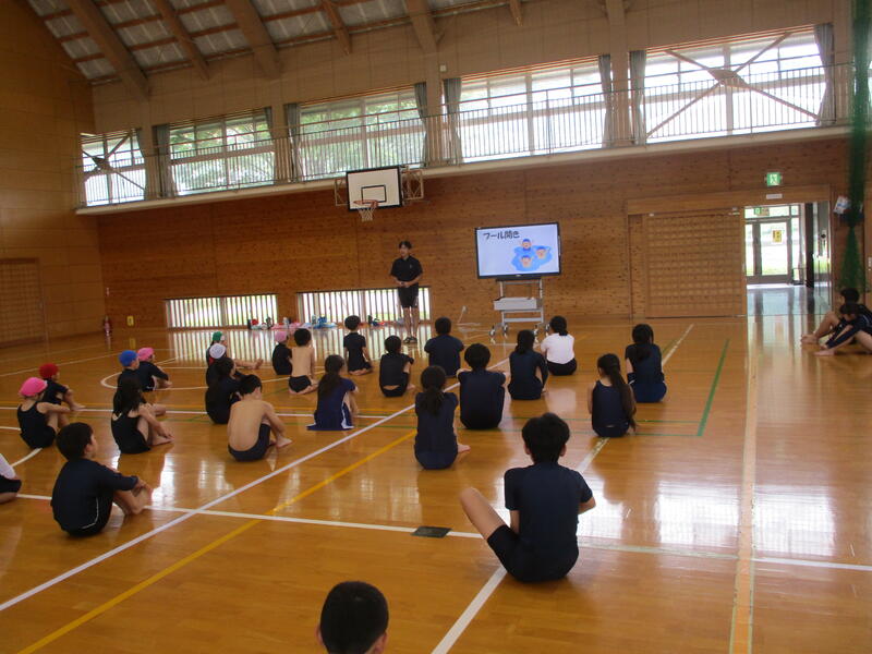 体育館では、校長先生のお話や各学年のめあてを発表した後、準備体操をしてプールへ移動しました。