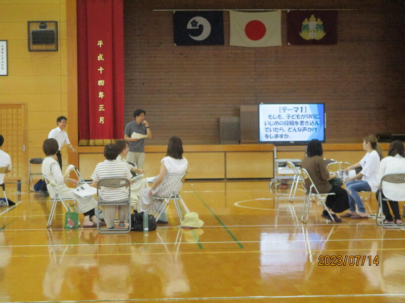 その後、保護者(26名)は体育館に集まって、PTA人権研修会をしました。教頭先生と上村副会長がファシリテートしながら、いじめや差別を絶対に許さない、また絶対に見逃さないことについて、意見交換をしました。
