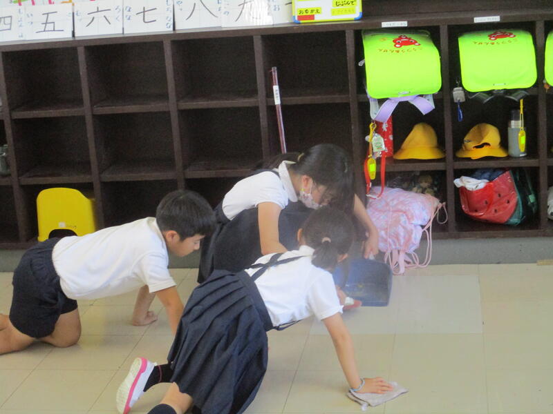班長さんを中心に、掃除の役割を確認して取りかかります。高学年生が優しく1年生に教えながら取り組むため、1年生も上手に掃除ができるようになりました。自分たちの学校です。いつもピカピカにして、気持ちよく学ぶ場所にしていきたいと思います。