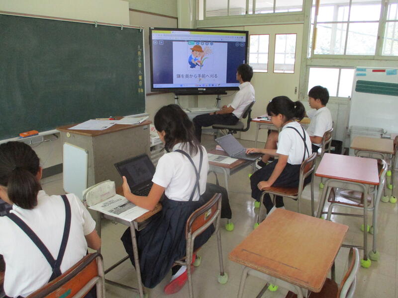 次に2階に上がると、5年生がタブレットで何かを作製しています。それは、稲刈り(10/13)の説明資料のようでした。