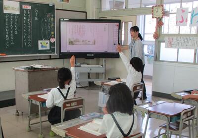2年は教科書や電子黒板を使い、挙手は指先まで“ピン!”
