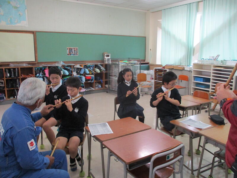 本日(12/12)、全校で牛舞い練習をしました。全体を大林の宮崎さんに、三味線を大林の西村さんにご指導いただきました。
