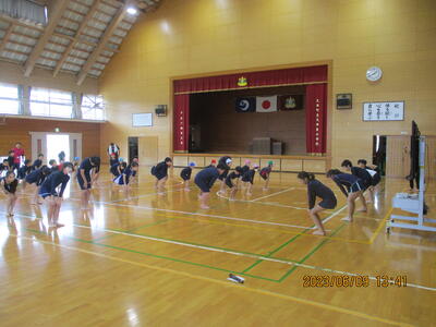 体育館では、校長先生のお話や各学年のめあてを発表した後、準備体操をしてプールへ移動しました。