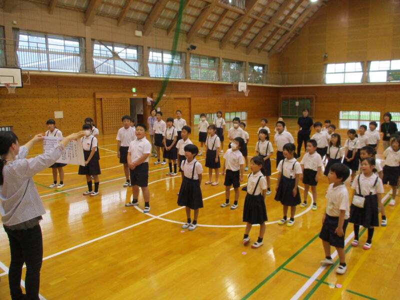 今月の歌「チャレンジ」を、音楽主任の指導で始めました。強弱を付け、元気に歌う様子に、教職員のやる気も高まりました。