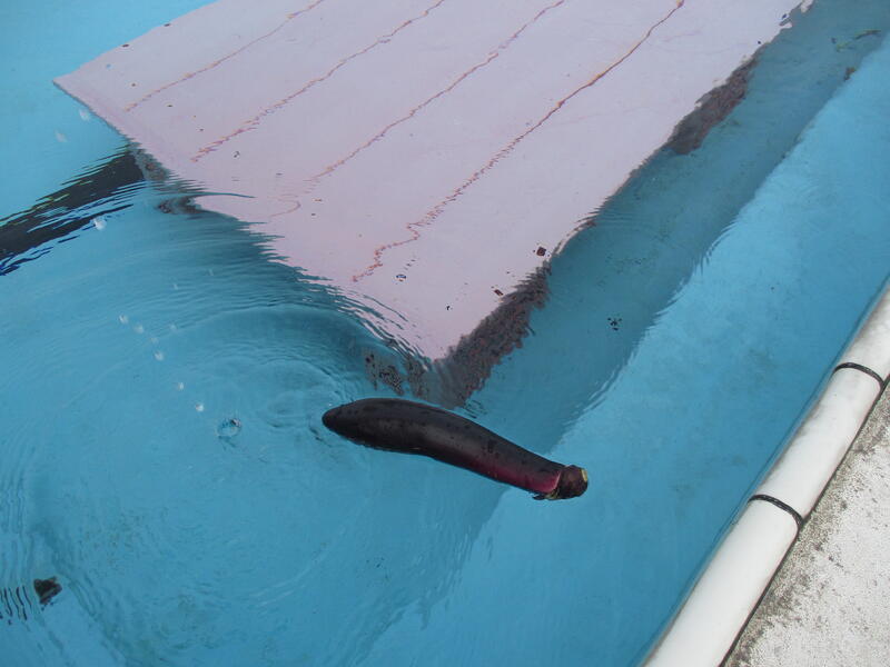 ①塩、②お米、③お酒、④ナスを準備して、順番にお清めをしました。最後にナスがプールに浮いたので、これで安心です。安全にプールを使用して、子どもたちの命を守り、自信を深める学習となるようにします。