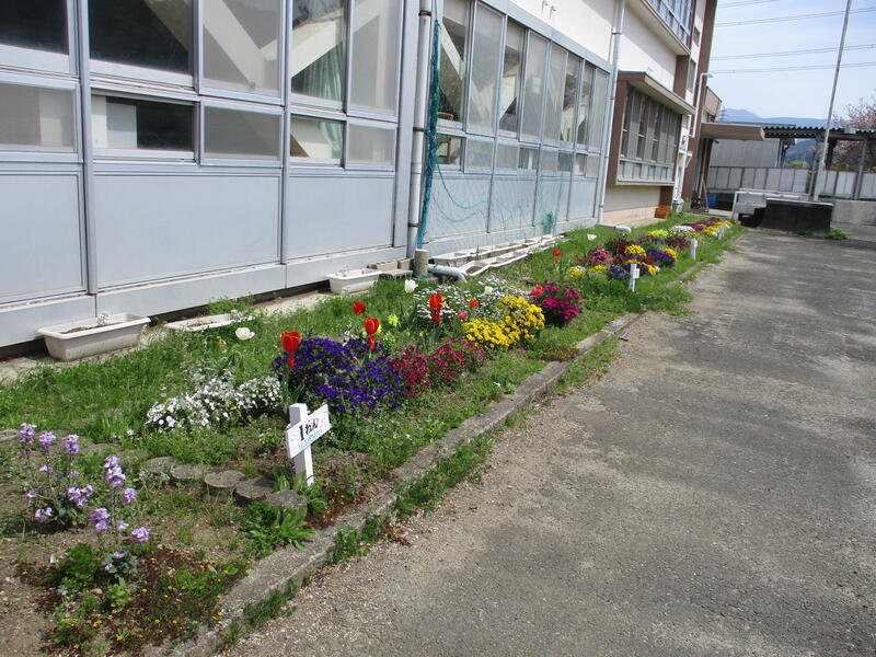 うさぎ小屋の“ルナ”と“アリス”は、ポカポカ陽気に誘われて、お昼寝中でした。校庭の桜も半分ほど散りはじめています。始業式や入学式のために育てていた花も、綺麗な花を咲かせています。また、学習園は草の勢いが増してきました。以上、簡単な紹介です。