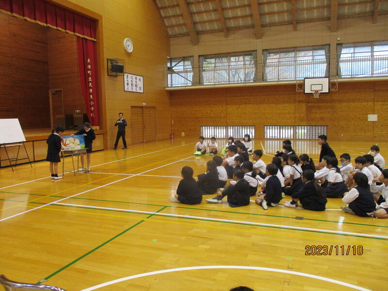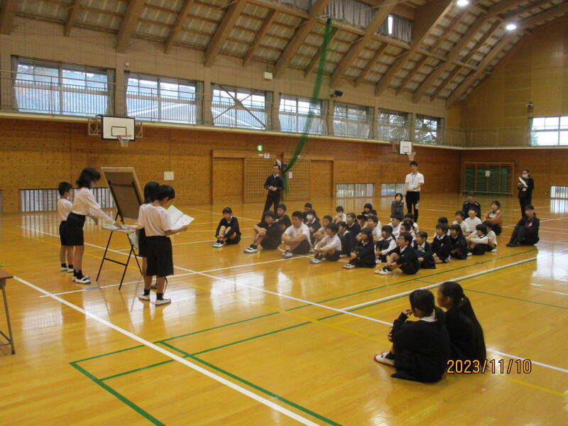 本日(11/10)、児童集会で図書委員会が発表をしました。