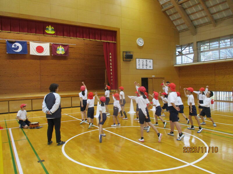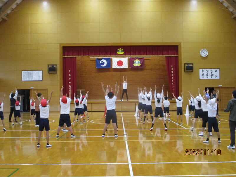 今回は、“ラジオ体操”と“応援団練習”をしました。ラジオ体操では、どこの運動なのか意識しながら、曲げ伸ばしが必要です。今回は、上に伸ばす動き(I字)と横に伸ばす動き(T字)に気を付けることを確認しました。応援団では、細かな動きを確認しながら練習していました。
