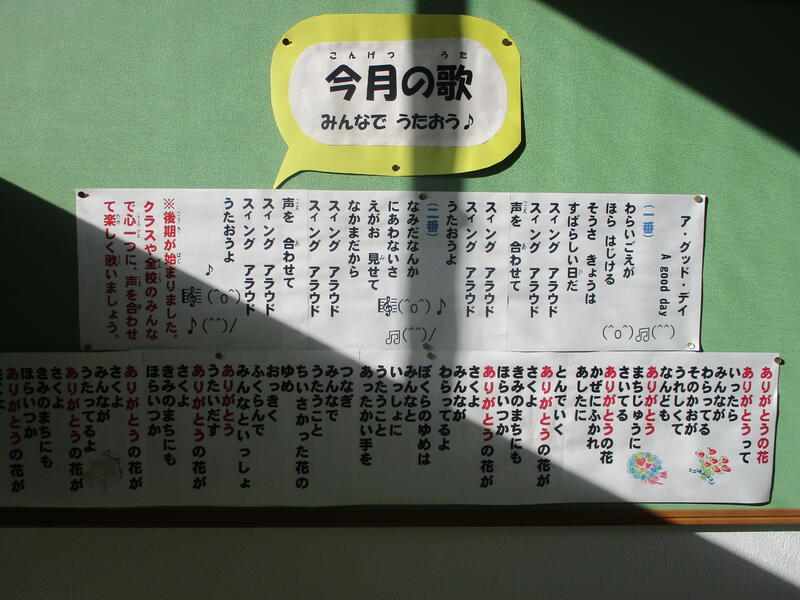 階段の踊り場にある掲示板は、12月になって“クリスマス”がテーマで構成されています。また、その隣には今月の歌が並び、思わず口ずさみたくなります。ともに心が温かくなる場所です。