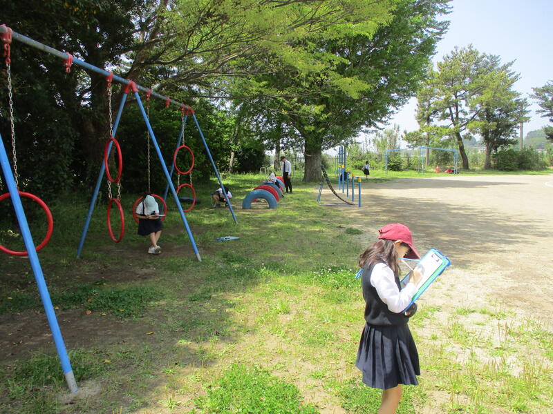 本日(4/18)の4時間目。3・4年生は、運動場で理科の学習をしていました。