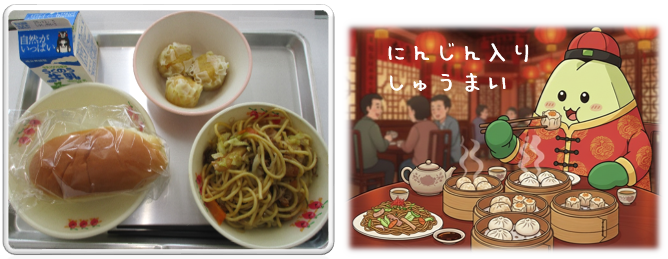 今日は、みんな大好きやきそばがメインの献立です。 にんじんシューマイは、小麦粉の皮でひき肉や野菜のあんを包んで蒸した中華料理で、軽食がわりになる点心の一つですよ。栄養満点の中華献立で、美味しく食べて、元気に週末を迎えましょう\(^_^)/
