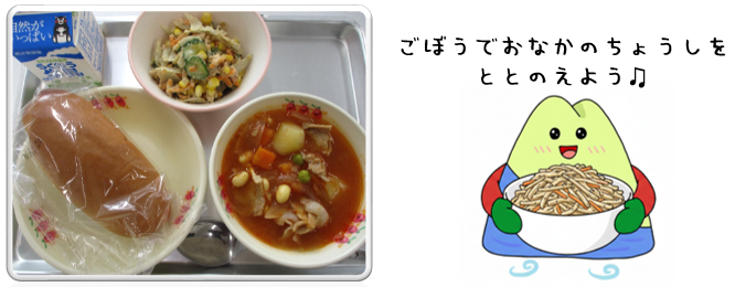 今日は洋風献立です。ごぼうは、食物繊維が豊富で「おなかの砂払い」と言われるそうです 。また、ごぼうを野菜として食べるのは、世界的にも珍しいそうですよ 。放送当番さんからは、「ごぼうがシャキシャキして美味しかったです。」とのコメントが聞かれました。ごぼうでおなかの調子を整え、今週も元気に頑張りましょう(^_^)b