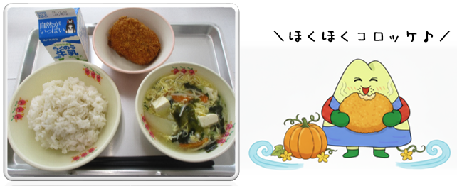 今日は、旬のかぼちゃコロッケがメインです。かぼちゃは風邪予防に役立つビタミンAが豊富です。温かいかきたまじるには、たまごやわかめなど具材たっぷり。放送当番さんからは、「コロッケは、カボチャ味で美味しかったです」との感想が聞かれました。温かい食事で体を温め、かぜに負けないようにしましょう(^O^)