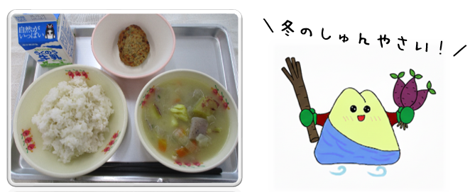 今日は、温かい和食の献立です。いもだんごじるの団子は、放送当番さんから大好評でしたね。ふりかけの「御飯の友」は、カルシウム補給のため、魚を骨ごと美味しく味付けしてご飯にかけて食べるという薬剤師さんの発想から生まれたそうです 。感謝していただき、午後も元気に頑張りましょう(^_^)v