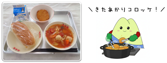 今日は、ミルクパンときたあかりコロッケの洋風献立です。汁物は、具材が入ったにくだんごのトマトスープです。トマトには、風邪を引きにくい体作りに役立つビタミンCやリコピンが多く含まれているそうですよ。温かいスープを飲んで、寒い季節も元気に乗り切りましょう\(^_^)/