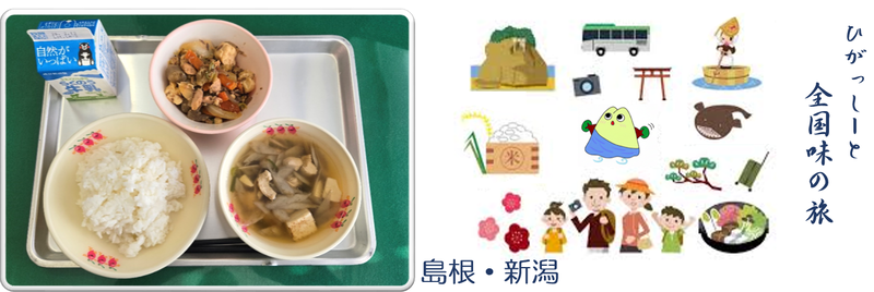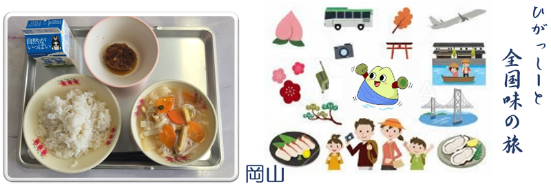 今週は 「全国学校給食週間」!今日は、瀬戸内海に面した岡山県の紹介です。岡山県では、そうめんを作る時にできる「ふし(端っこ)」の部分を「ぱち」と呼びます。茹でる時に「パチッ」と音がすることからそう呼ばれるようになったそうです。今日はその「ぱち」を入れた、具だくさんで栄養満点の汁物です。放送当番さんからは「岡山の人はこれを食べるんだなと思いました」という、旅の気分を味わった感想が届きました(^^)