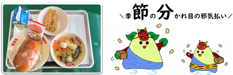 今日は「節分」にちなんだ行事食です。節分とは「立春」の前日のことを言います。昔から、季節の変わり目には「邪気(じゃき)」という悪いものが生じると考えられてきました。そこで、豆やいわしなどを使って邪気払いをする慣習があります。いわしには、焼くときの煙や強い臭いで鬼を追い払うという言い伝えがあります。今日はみんなが食べやすい、カリカリのフライに仕上げました。 節分豆も「魔を滅する(まめ)」という言葉にかけて、一年の健康を願っていただきました!(o^ ^o)