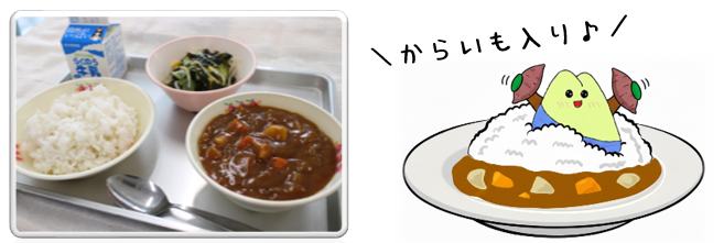 今日は、大津町特産のからいもがたっぷり入った「からいもカレーライス」です!副菜のわかめなどの海藻は、成長期に不足しがちなカルシウムや鉄などの栄養が豊富に含まれています。放送当番さんからは、「サラダは、わかめとコーンが絡み合って美味しさも増し増しでした!」や「カレーはスパイスの味の中にからいもの甘みが感じられて美味しかったです」との食レポがありました(*^_^*)