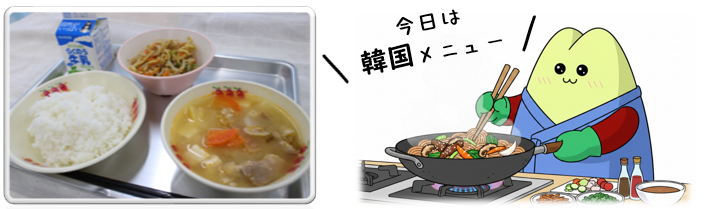 今日は韓国料理でおなじみの「キムチ」や「チャプチェ」が登場しました。チャプチェは、さつまいものでんぷんからできた、もちもちした春雨と、お肉、野菜を甘辛いタレで炒めた韓国の料理です。今日は、こんにゃくや大豆ミートが使われていましたね。キムチ入り豚汁については「辛そうで食べれるかなと思ったけど、豚汁の味噌とキムチの味がマッチして美味しかったです。」と食レポがありました\(^_^)/