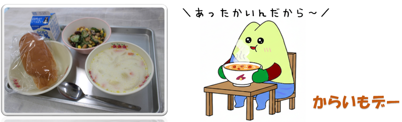 今日は大津町のおいしい「からいも」を味わう「からいもデー」です。大津町は火山灰を含んだ土がからいも作りに適しており、甘くてホクホクのおいしいからいもが育ちます。今日はそのからいもをたっぷり使ったクリームスープでした。ビーンズサラダは、放送当番さんから「豆の味が口いっぱいに広がってきゅうりの食感と混ざり合うのがよかったです」との食レポがありました。地元の恵みに感謝していただきました( ^o^)ノ