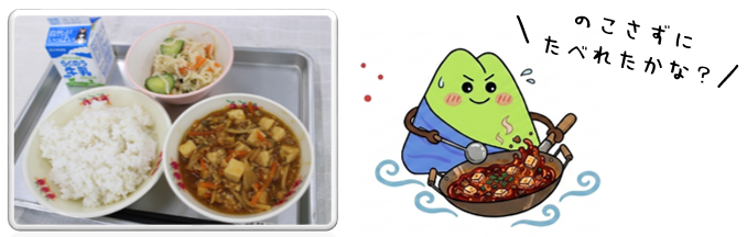 今日は「マーボー豆腐」が登場しました。豆腐に味がしみ込んでいて美味しかったですね(^^) 放送当番さんの食レポでは、小さいおかずについて「大根ときゅうりがシャキシャキしていて食感が楽しめました」とコメントがありました。 給食には、生産者さんやお店の方、給食を作ってくださる方、配送の方など、たくさんの方の思いが込められています。感謝の気持ちを込めて「いただきます」「ごちそうさまでした」を言いましょう(^○^)