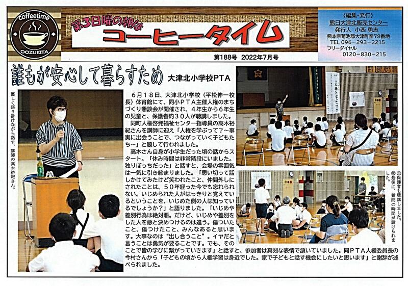 6月18日(土)にPTA主催で行われました「人権のまちづくり懇談会」の様子が、熊本日日新聞社の大津地区折り込み「コーヒータイム」(第188号 2022号7月号)に掲載されました。下の記事は、熊日大津北の清原さんの記事からの抜粋です。