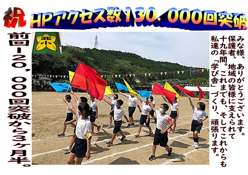 大津北小HPアクセス数が130,000回を突破しました。前回12万回突破から約3ヶ月半です。北小内外の教育情報の発信、周知、話題の提示として学校HPを開設していますが、ご利用誠にありがとうございます。今後とも、見やすい内容を心がけて作成して参ります。