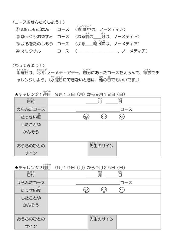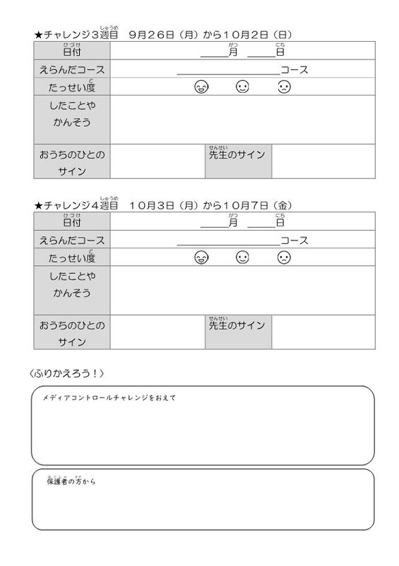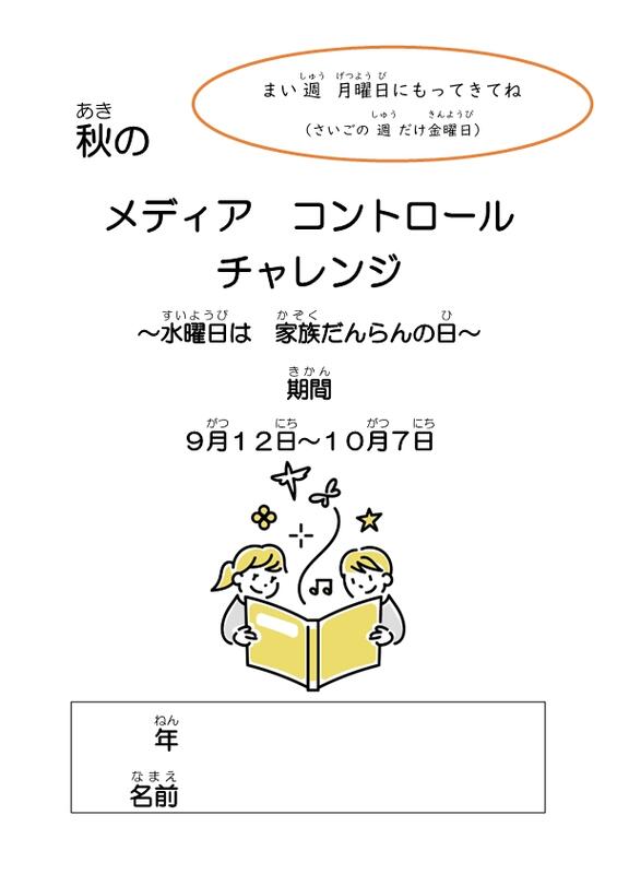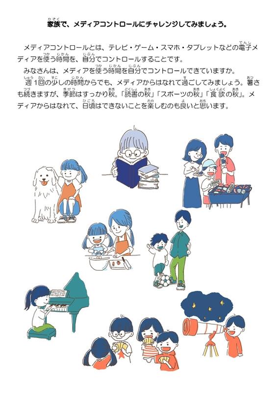 本時から始まるメディアチャレンジでは、1週間に10分でも良いので、ゲーム、スマートフォン、PC等デジタル機器の使用を避け、できればご家族で、読書や団らん、あるいは知的ゲーム、体操、休日の予定会議、子どもが生まれたときのはなし、家族新聞作成等々、いろんなアナログなことにチャレンジしてみましょう。