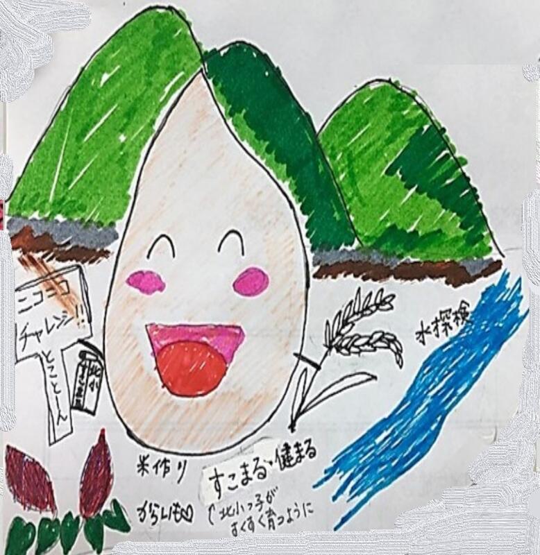 「北小校区で取れたサツマイモに、ニコニコ チャレンジ トコトンが書かれています。またその間に(仮名ですが)、お米の「にっこりくん」や「す米(マイ)る北小っ子」がいますよ。稲穂が左にあり、色のバランスも良いですね。これを参考にしてくださいね。