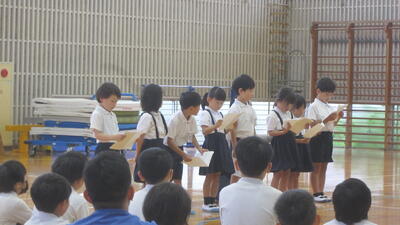自分も人も幸せにできる人生になれるよう、これからの児童の行動を見ていきたいと思います。それでも忘れたり、失敗したりしながら人は成長していきます。そんなときこそ、なかまが、教師が、親が、周りの人が思い出させていくと安心して過ごせる笑顔あふれる学校になれると確信しています。こころが「にっこり」できた集会でした。(校長 上田 玲子)