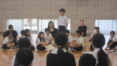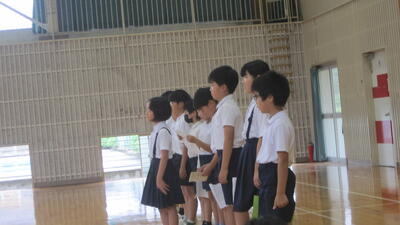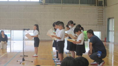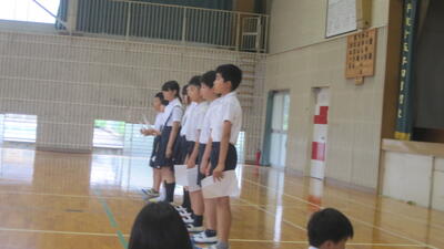 暑かったので、冷房が効く音楽室で実施しました。今回の進行も児童会執行部です。