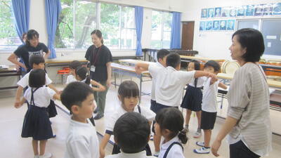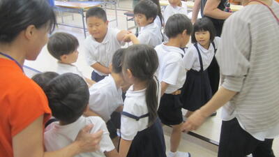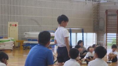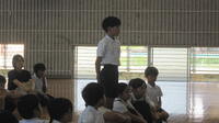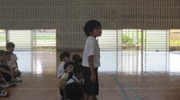 次に「おもちゃのちゃちゃちゃ」で「ちゃ」の時に手拍子を入れる頭脳を使った斉唱をします。縦割り班で練習をしたあと、一斉にみんなでやってみます。まあまあ難しい・・・。でも練習の成果があって一斉でするときはほぼ上手くできていました。上級生や得意な人のリーダーシップがものをいいます。