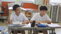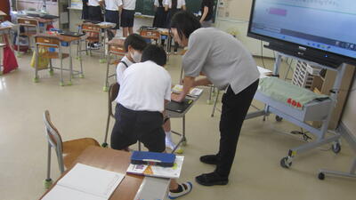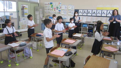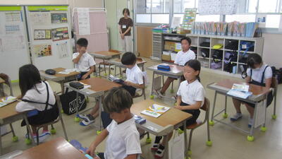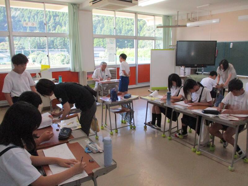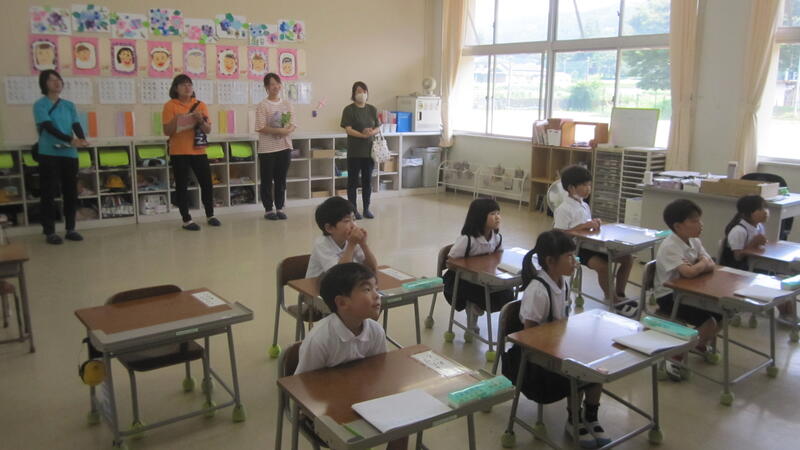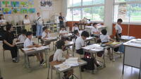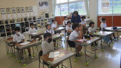 いつもしっかり集中して学習している1年生ですが、今日は久しぶりの元担任の先生方の顔を見てにやり。